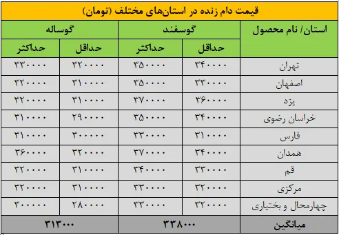 روند قیمتها در بازار فروش دام در استانها نشان میدهد که گوسفند زنده به طور میانگین ۳۳۸ هزار تومان و گوساله ۳۱۳ هزار تومان قیمت دارد.