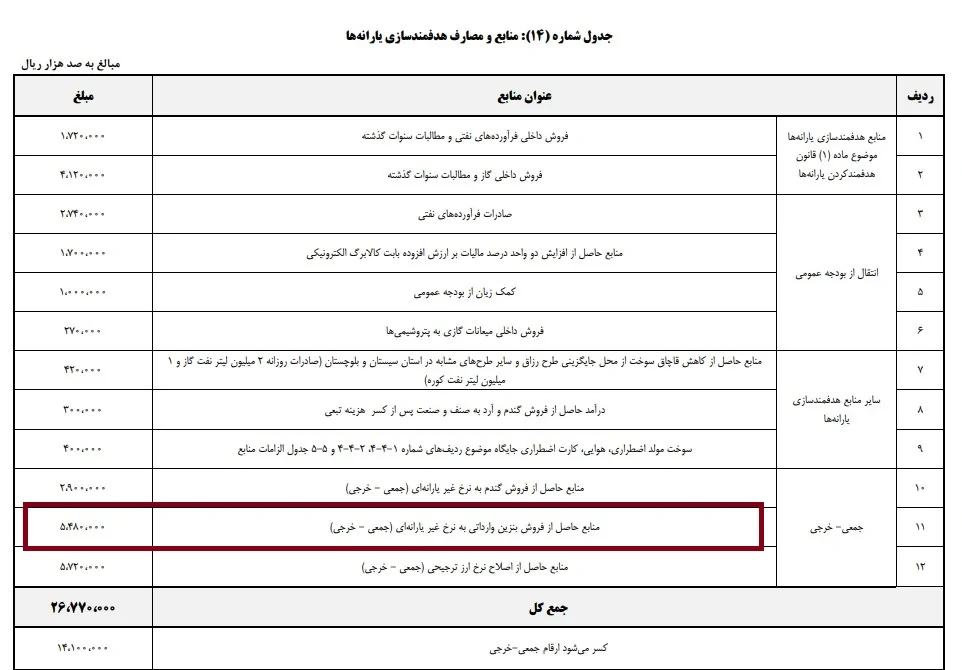 اما این ردیف بسیار غیرشفاف است و سوالات مهمی را برمی‌انگیزد. آیا منابع حاصل از فروش بنزین وارداتی به نرخ غیریارانه‌ای مربوط به واردات پنج تا شش میلیارد دلاری بنزین در سال است؟ یا این ردیف به واردات بنزین سوپر مربوط می‌شود؟