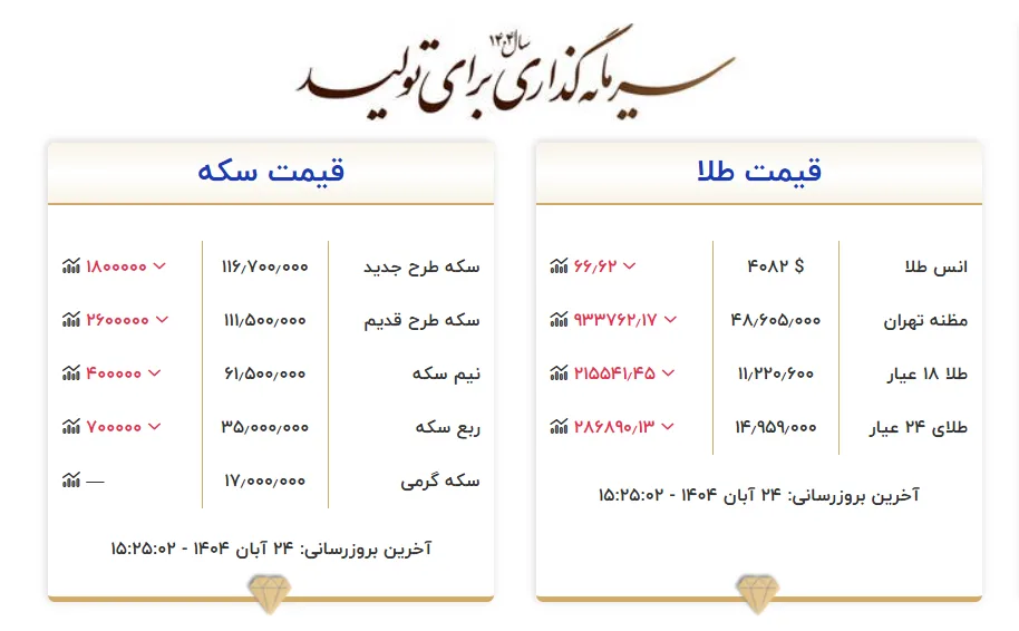 تهران- ایرنا- بازار تهران تحت تاثیر ریزش قیمت طلا در بازارهای جهانی، روز شنبه – ۲۴ آبان – نرخ ها را کاهشی آغاز کرد به طوری که قیمت هر قطعه سکه تمام طرح جدید در کانال ۱۱۶ میلیون تومان قرار گرفت.