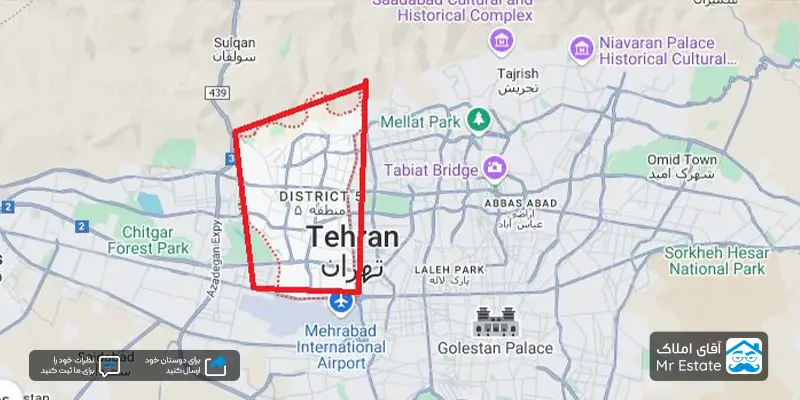 به گزارش اقتصاد فارس، منطقه ۵ شهرداری یکی از مناطق گسترده تهران است که در غرب و شمال غربی پایتخت قرار دارد. این منطقه از هفت ناحیه و ۲۹ محله تشکیل شده و از شمال با رشته‌کوه البرز، از جنوب با بزرگراه شهید لشگری و میدان آزادی، از شرق با منطقه ۲ و از غرب با منطقه ۲۲ تهران و استادیوم آزادی مجاورت دارد.
