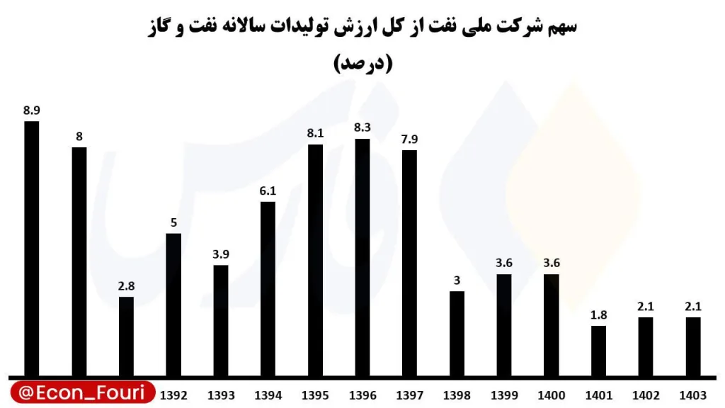 اما آمار رسمی شرکت ملی نفت تصویر متفاوتی ارائه میدهد: سهم واقعی این شرکت از ارزش تولیدات نفت و گاز طی ۱۵ سال گذشته در بهترین حالت تنها حدود ۹ درصد بوده است. این سهم در سه سال گذشته حتی کاهش بیشتری داشته و به کمتر از ۲ درصد رسیده است؛ موضوعی که به گفته برخی کارشناسان، ظرفیت سرمایهگذاری و توسعه در صنعت نفت را به شدت محدود کرده است.